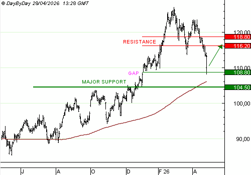 Cette reprise haussière serait invalidée par la rupture du support majeur à 104,5 CHF.