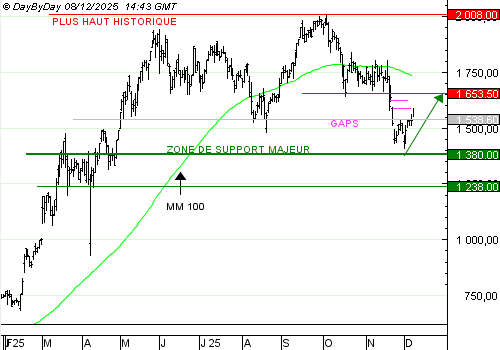 RHEINMETALL a rebondi à proximité de son support majeur. Elle approche du bas du gap baissier de fin novembre, ce qui nous donne l'occasion d'une première prise de profit.