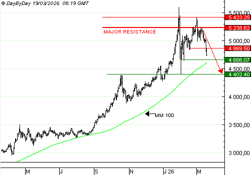 L'or a nettement enfoncé sa zone de support à 5 000 dollars hier après-midi. Il accélère et approche du support à 4 666 dollars. La forte volatilité rend les niveaux peu précis, et nous proposons une première prise de profit. Le mouvement devrait se poursuivre ensuite vers 4 402 dollars.