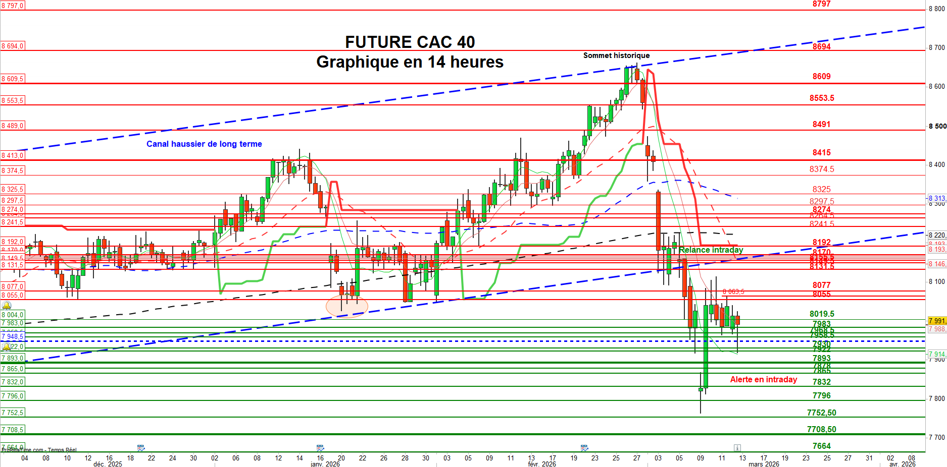Graphiquement, le future CAC 40 (données à 14h) conserve une certaine capacité de rebond. Toutefois, pour inverser la pression baissière installée depuis le début du mois — après la rupture en gap baissier consécutive à l’annonce de l’entrée en guerre au Moyen-Orient — le chemin reste long et semé d’obstacles.