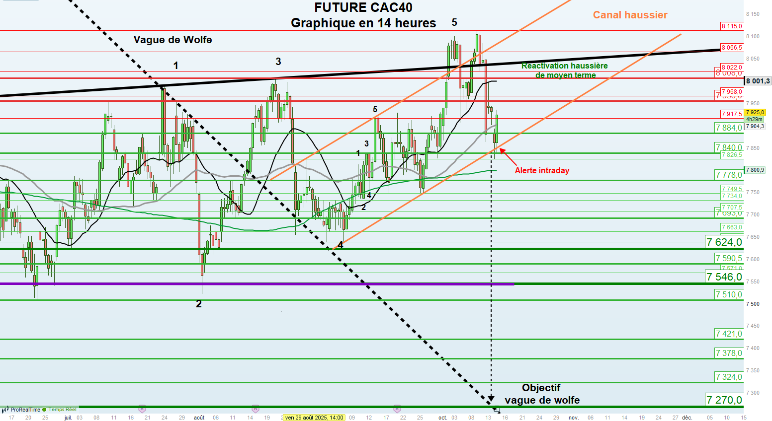 À contrario, une rupture en clôture sous la partie inférieure du canal, conjuguée à la cassure du support intermédiaire situé à 7 840 points, constituerait un signal technique défavorable, ouvrant la voie à une poursuite du mouvement correctif en direction du support majeur positionné à 7 546 points, niveau sur lequel l’indice a déjà rebondi à trois reprises. Une rupture de ce dernier seuil provoquerait, quant à elle, une reprise baissière plus marquée, avec pour objectif la cible de la vague de Wolfe située à 7 280 points.