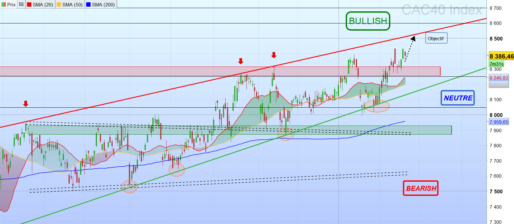 A l’inverse, l’indice devra impérativement défendre la zone des 8 247 points, ancienne résistance devenue support majeur. En l’absence de relais haussiers ou en cas de nouvelles défavorables, un retour dans l’ex-range 8 030 / 8 162 points resterait plausible, traduisant un affaiblissement du momentum acheteur au profit des vendeurs. Dans ce cas, un pullback vers la base du canal ascendant, autour de 8 014,5 points, ne serait pas exclu. Tant que ce seuil tient en clôture, la structure haussière de moyen terme resterait préservée. En revanche, une rupture nette fragiliserait le scénario technique et pourrait ouvrir la voie à une consolidation plus marquée, avec des objectifs vers 7 731 puis 7 603 points, correspondant à d’anciennes zones de polarité et de congestion.