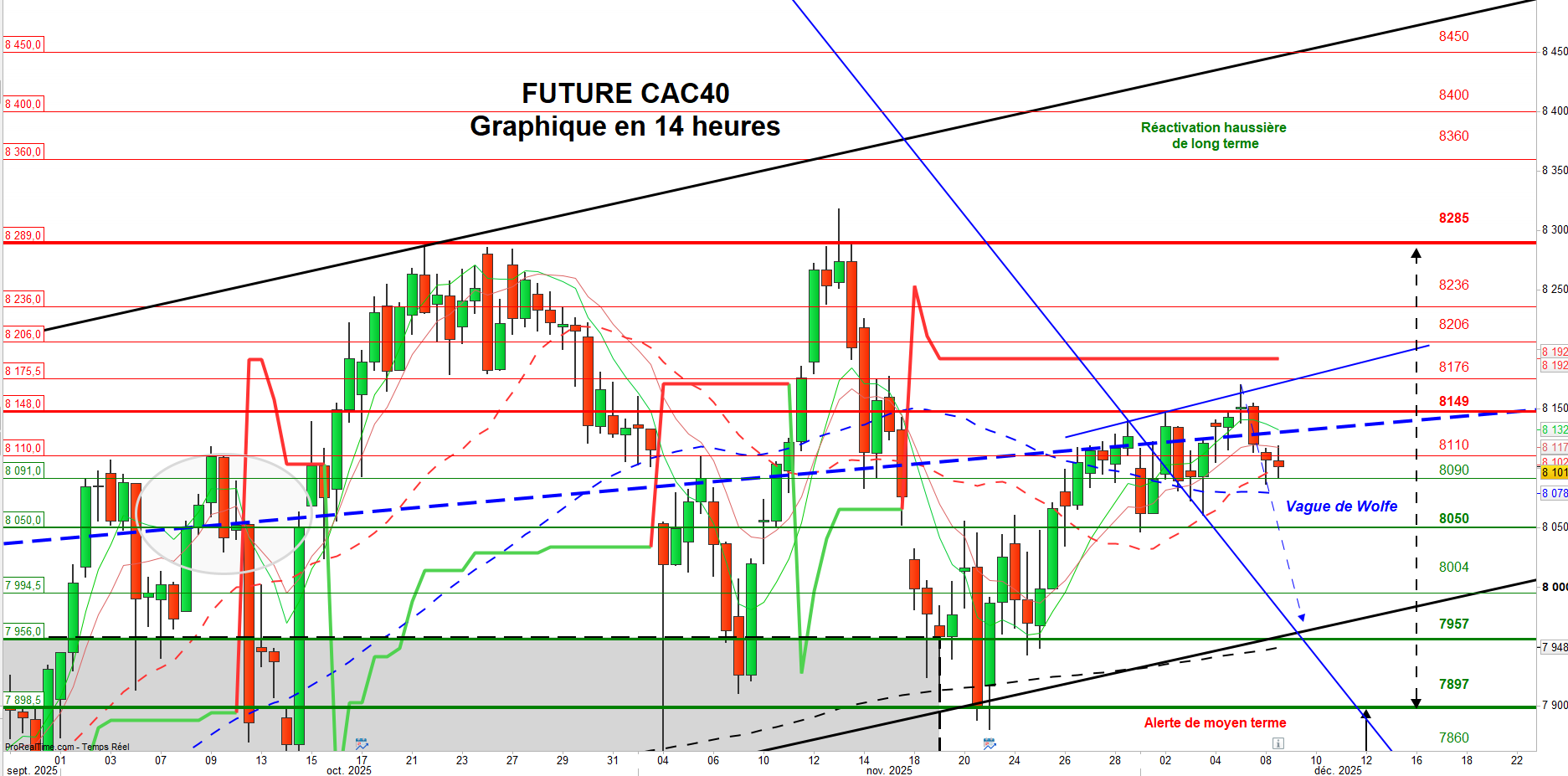 À contrario, la formation d’une vague de Wolfe pourrait entraîner un repli en direction de la borne inférieure du canal haussier de long terme, située autour de 7970 points, selon l’ampleur et la rapidité du mouvement.