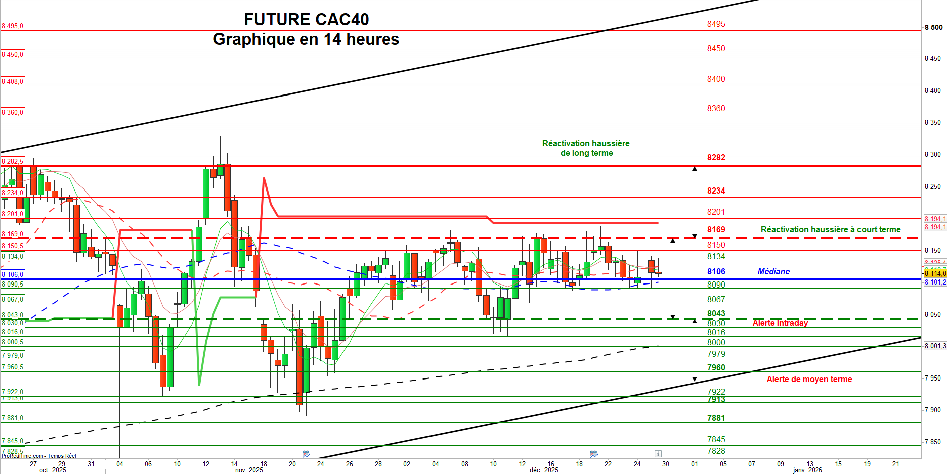 Graphiquement, le Future CAC 40 (données en 14h) poursuit sa phase de neutralisation, évoluant dans la partie centrale d’un trading range compris entre 8169 et 8043 points depuis la fin du mois de novembre.