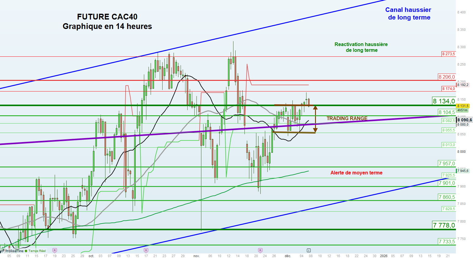 Les supports sont : 8134 voire 8104,5 et 8082,5 puis 8055,5 voire 8013 et 7957 puis 7925,5 voire 7901 et 7860,5 puis 7829,5 voire 7778 et 7733,5 voire 7696 puis 7644 et 7619 voire 7590 puis 7548 et 7422 voire 7375 puis 7251,5 et 7048.