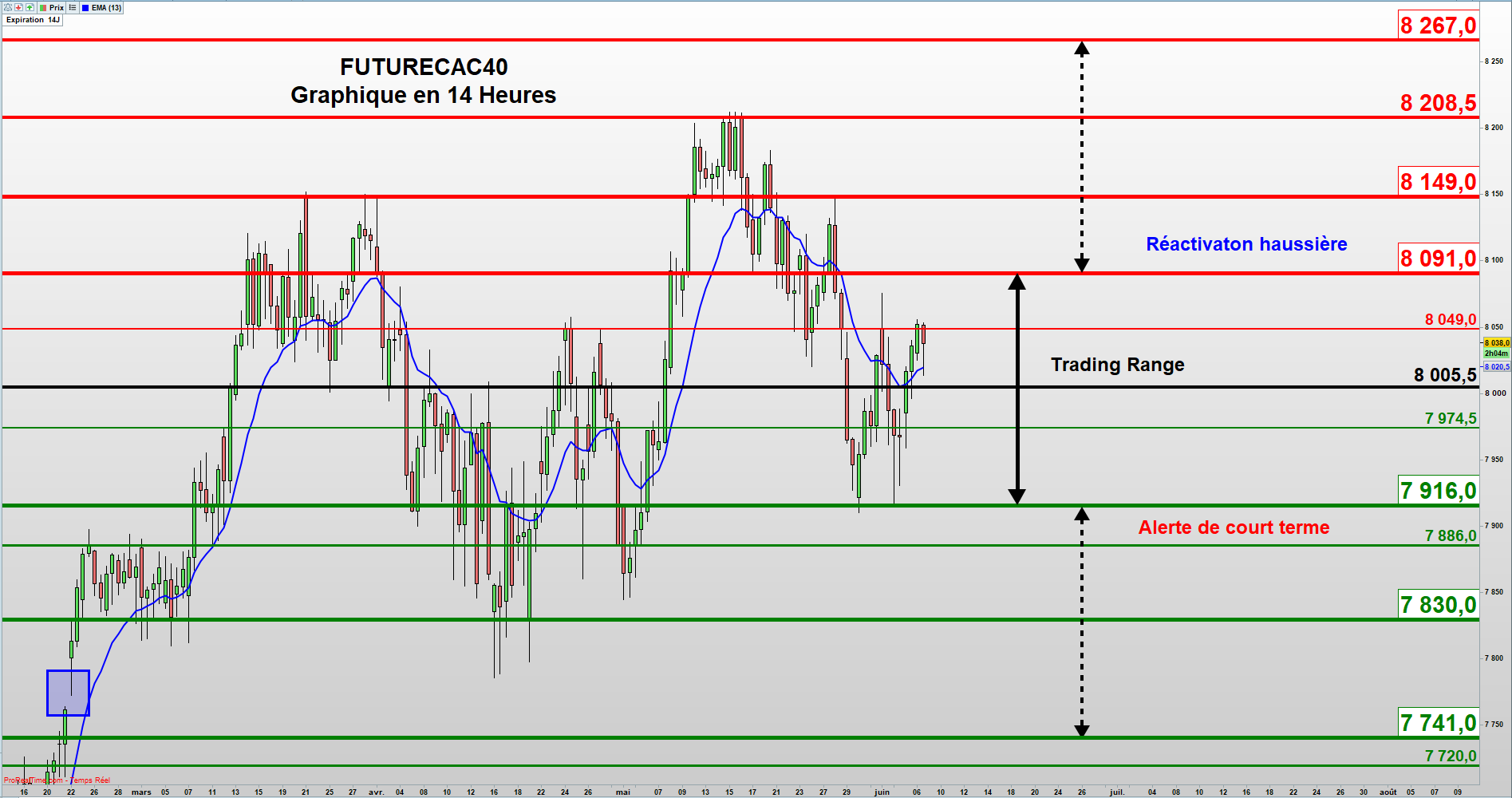 Graphiquement, le Future CAC40 (Cf. graphique joint en 14 Heures), évolue dans une plage de fluctuation de plus en plus étroite ce qui nous permet de resserrer le large trading range 7830/8149 à la zone 7916 et 8091. La médiane de la zone, située à 8005,5, devient notre alerte intraday. En effet, le franchissement de l’un de ses niveaux réactiverait la dynamique. Peu d’éléments permettent de déterminer le sens de la sortie mais le manque de soutien et de participation nous invitent à la prudence.