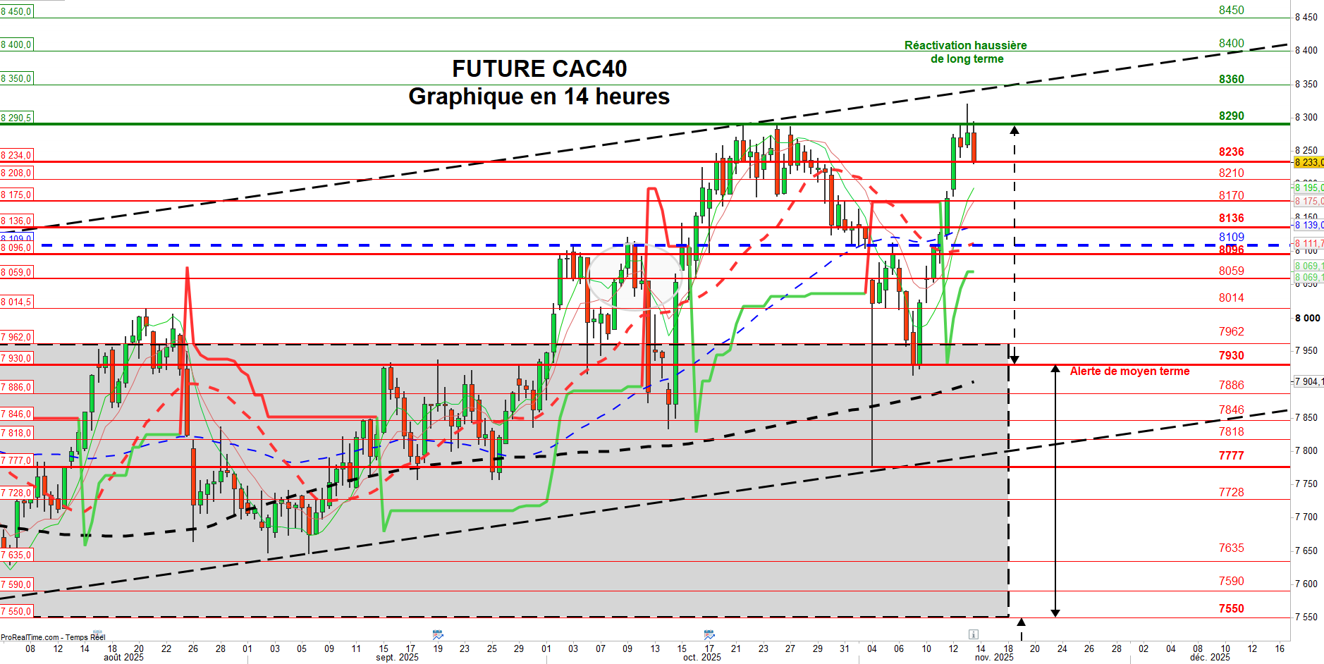 Graphiquement, le Future CAC 40 (données en 14h) confirme son rebond, en inscrivant un nouveau record historique en séance à 8314,23 points, dans le sillage de la levée du blocage budgétaire(shutdown) aux États-Unis.