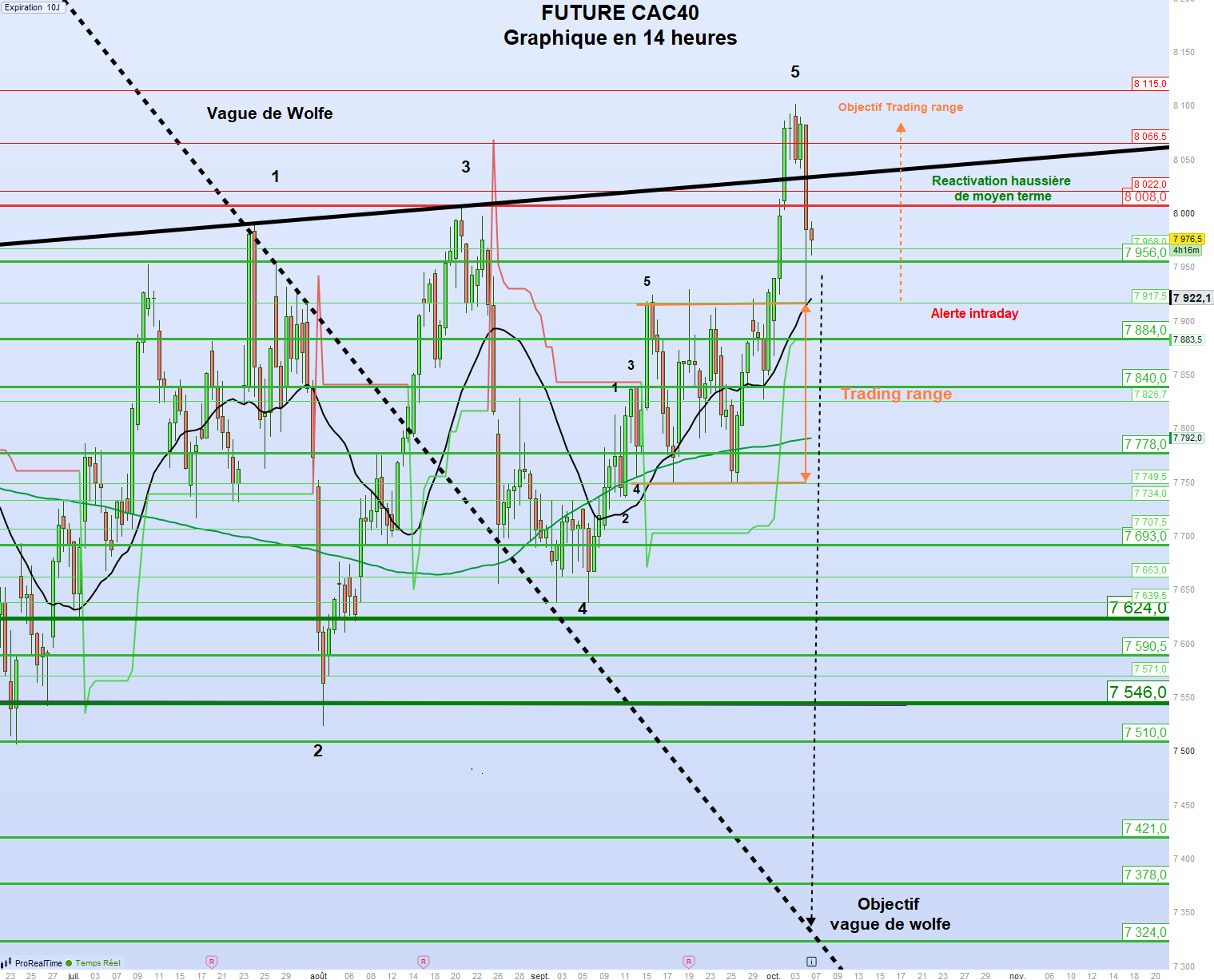 À l’inverse, À l’inverse, un débordement du seuil des 8 035 points constituerait un signal précurseur d’invalidation de la vague de Wolfe, invalidation qui serait pleinement confirmée en cas de franchissement des plus hauts historiques situés à 8 236 points, représentant une résistance majeure. Un dépassement marqué, en clôture et sur un minimum de trois séances consécutives, raviverait alors la dynamique haussière de long terme, avec pour cible les 9 400 points.