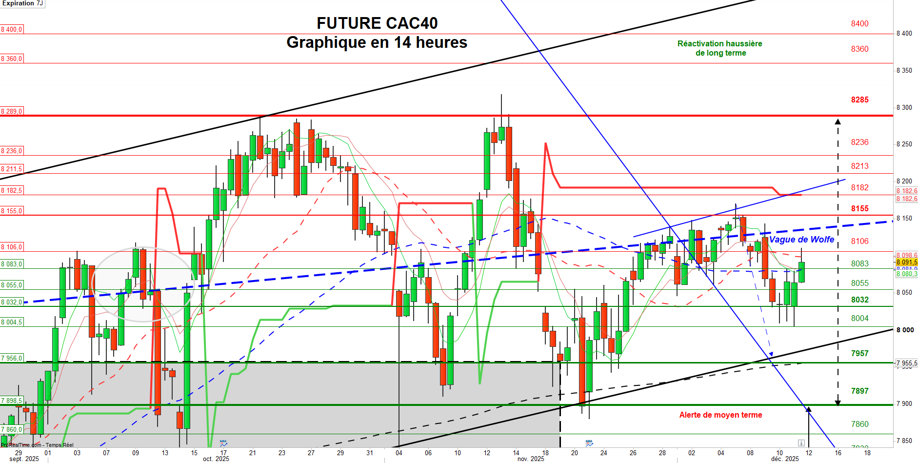 À l’inverse, un retour sous 8055 points affaiblirait le rebond technique, et une cassure nette en clôture du point bas du jour à 8 004,5 relancerait la phase de consolidation en direction de la cible de la vague de Wolfe à 7957 points, voire 7920 points selon la vitesse du mouvement. Cette zone de support majeur devrait entraîner une réaction technique. Si tel n’était pas le cas, la consolidation pourrait évoluer vers une véritable correction, avec un risque de repli vers les zones de soutien situées à 7696 / 7644 points.