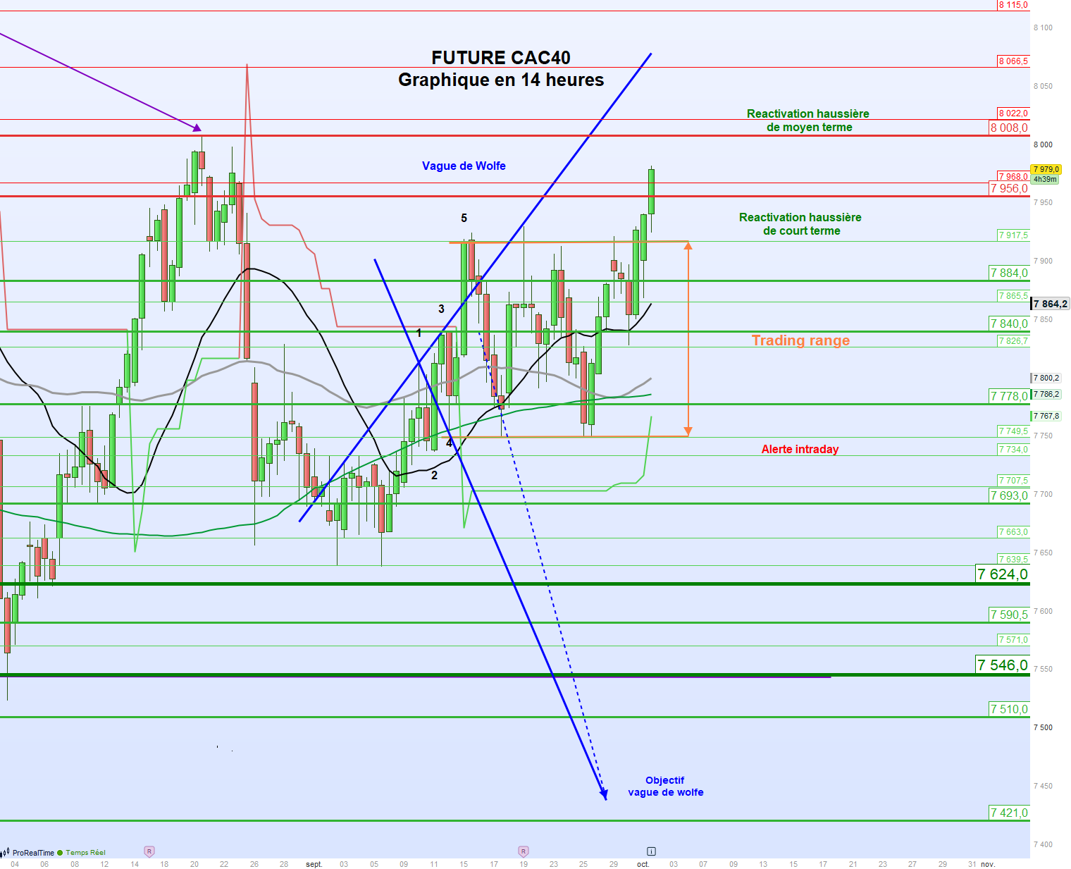 À contrario, une réintégration du canal horizontal suivi d’un enfoncement du seuil des 7 884 points constituerait un signal précurseur d’une reprise de la phase baissière, laquelle serait pleinement confirmée par la rupture de la médiane du trading range, située à 7 840 points. Tant que ce niveau pivot demeure préservé en clôture, le biais dominant conserve une orientation haussière. À l’inverse, la rupture de ce support ouvrirait la voie à une reprise du mouvement baissier, avec pour cible les 7 749,5 points. Une cassure de ce seuil d’alerte intraday réactiverait la dynamique baissière de court terme, avec comme premier palier la ligne de cou du triple top à 7 546 points, avant de viser, en extension, la zone de la structure de retournement en vague de Wolfe à 7 440 points.