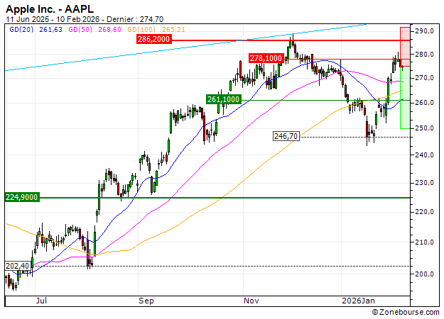 Le titre Apple Inc. présente une configuration positive sur le court terme au-dessus du support des 261.05 USD. La zone de résistance des 278.12 pourrait toutefois engendrer quelques prises de bénéfices après la hausse de ces dernières séances.