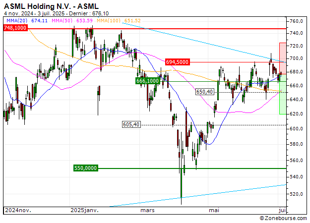 Le titre ASML présente une configuration positive sur le court terme au-dessus du support des 650 EUR. La zone de résistance des 700 EUR pourrait toutefois engendrer quelques prises de bénéfices après la hausse de ces dernières séances.