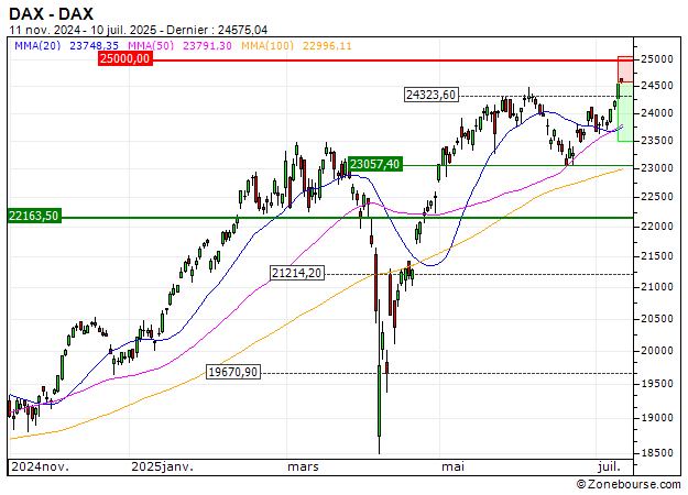 Le DAX est, en effet, en zone de surachat et la proximité du niveau actuellement testé confère un timing intéressant pour mettre à profit une correction technique dans les séances à venir en direction des 23500 points.