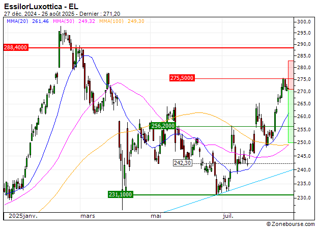La configuration technique ainsi que les fondamentaux du titre EssilorLuxottica laissent présager une consolidation, au moins à court terme. La résistance des 275.5 EUR devrait jouer pleinement son rôle et faire barrage au mouvement haussier initié à court terme.