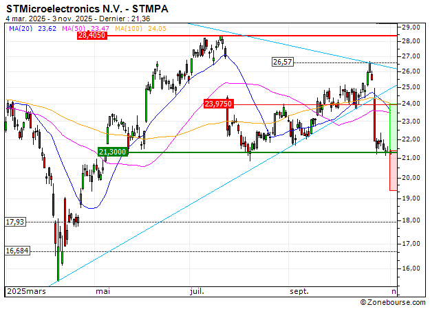 L'action STMicroelectronics N.V. atteint des territoires survendus à l'approche d'un niveau important en données quotidiennes situé vers 21.31 EUR. Cette situation accrédite la possible mise en place d'un rebond technique du titre. Ainsi, les cours pourraient retrouver de la vigueur et s'orienter en direction des 24 EUR.