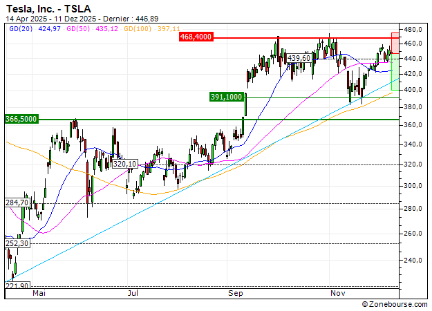 La reprise technique dernièrement observée sur Tesla, Inc. devrait trouver un point d'arrêt dans la zone de cours actuelle. Le timing apparaît pertinent pour anticiper des prises de bénéfices en direction des 400 USD, zone de convergence avec la moyenne mobile à 100 jours.