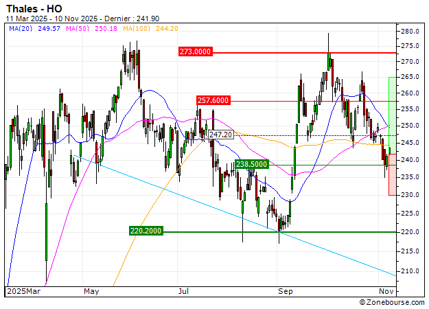 Le titre Thales a fortement corrigé ces dernières séances et revient à proximité d'une zone de soutien majeur qui pourrait susciter quelques achats à bon compte.