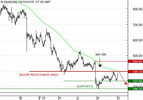 NOVO NORDISK est le prince déchu de la pharmacie européenne. Son médicament contre l'obésité est moins efficace que celui de son concurrent américain, et la pharmacie européenne n’est pas en odeur de sainteté aux États-Unis. Le titre s’est installé en tendance baissière depuis un sommet en 2024, antérieur aux mauvaises nouvelles. Il est revenu voici quelques jours sur l’ancien creux autour de 398,2 DKK, le niveau idéal pur repartir à la baisse. Nous envisageons un retour vers le support à 337,6 DKK et peut-être 286,2 DKK. Le franchissement de la résistance à 398,2 DKK invaliderait le développement baissier à court terme.