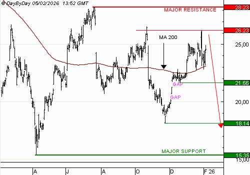 STMICROELECTRONICS évolue dans une large consolidation depuis mi-2024, entre 18 et 28 euros, avec quelques excès de part et d’autre. La moyenne mobile à 200 jours illustre cette absence de tendance : elle est plate autour de 23 euros. Après un pic de hausse à 26,23 euros, le titre a reflué, mais il reste au-dessus de sa moyenne. Le principe de balancier de la consolidation signifie qu’il devrait repasser sous la moyenne et se rapprocher du bas de sa consolidation dans les semaines qui viennent. Nous visons dans un premier temps le support à 21,66 euros, puis, selon le marché général, entre 18 et 20 euros, à préciser.