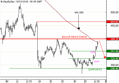 NOVO NORDISK a connu une forte reprise en fin d’année 2025, après un an et demi de baisse qui avait divisé ses cours par plus de quatre. La résistance à 398,2 couronnes danoises est proche, elle est renforcée par la moyenne mobile à 200 jours baissière. Elle devrait interrompre la reprise. Deux gaps ont été ouverts au cours de la hausse, et le premier au moins, à 351,9 DKK devait être comblé. C’est notre première cible. Selon les conditions de marché, l’ancienne résistance à 324,4 DKK pourrait ensuite être rejointe. Le franchissement de la résistance à 398,2 DKK invaliderait ce développement baissier à court terme.