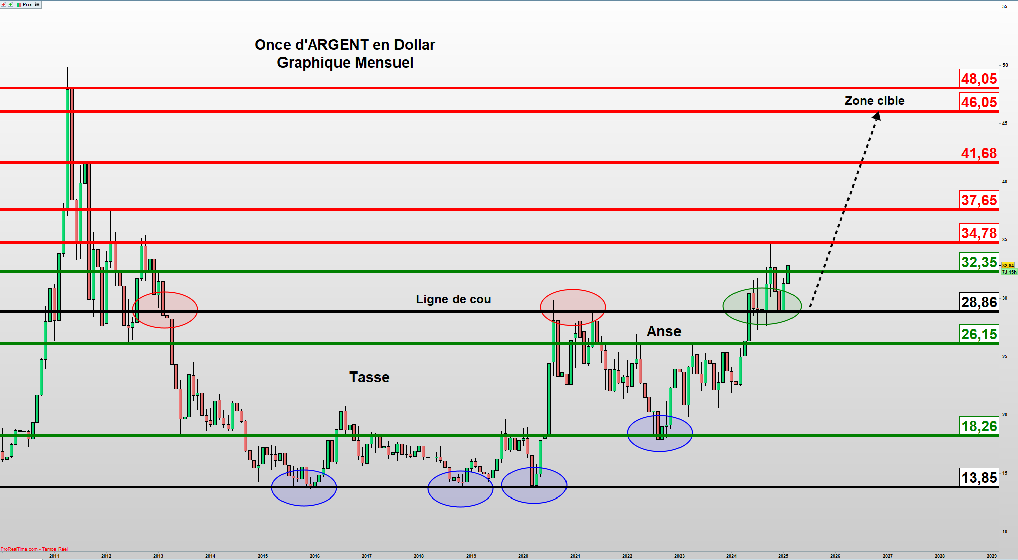 Le débordement de 28,86, sa préservation systématique et le fait que les prix s’en éloignent depuis mai 2024, valident la large configuration dont la cible idéale est située à 46,05.