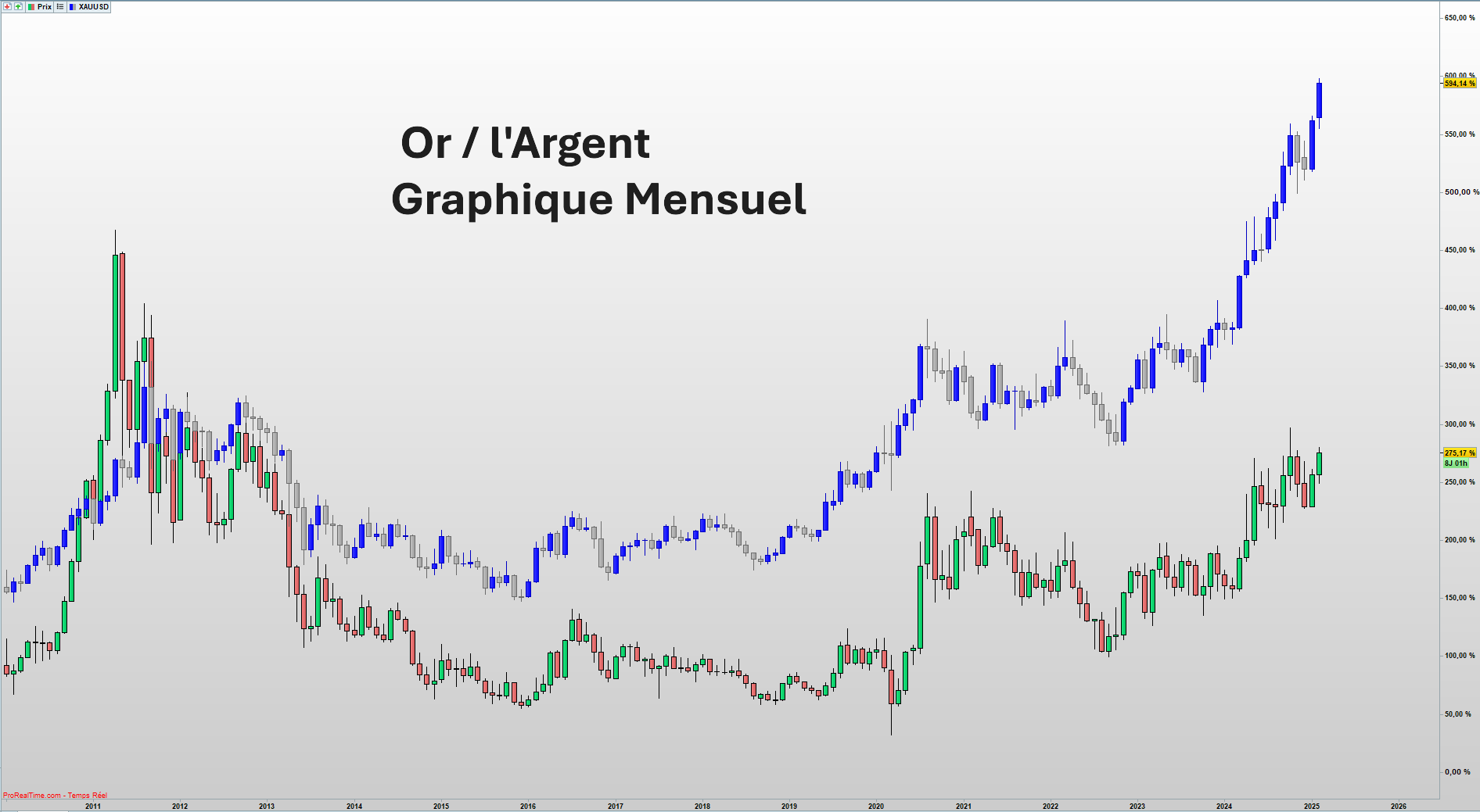 Qui plus est, le graphique comparé de l’or et de l’argent, témoigne clairement de la corrélation historique entre les deux actifs. Or, la vive accélération récente de l’or permet d’envisager un rattrapage du métal de la transition énergétique à brève échéance.