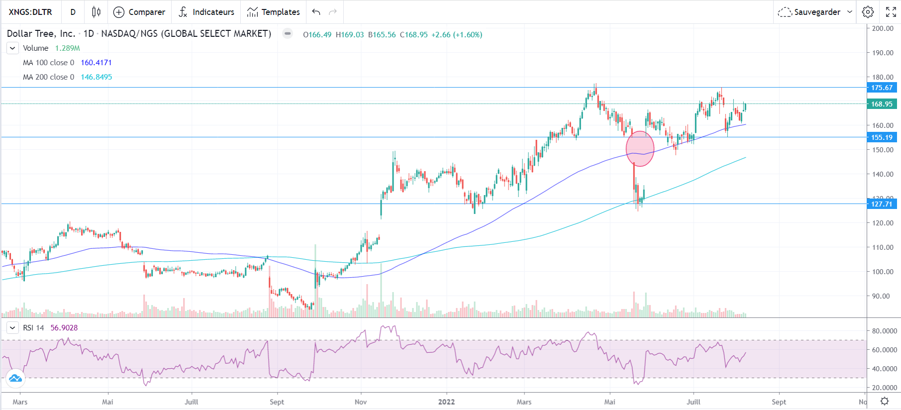 Dorénavant à 169$, nous anticipons la mise en place d’un double Top qui entrainerait notamment un comblement du gap à 145$.