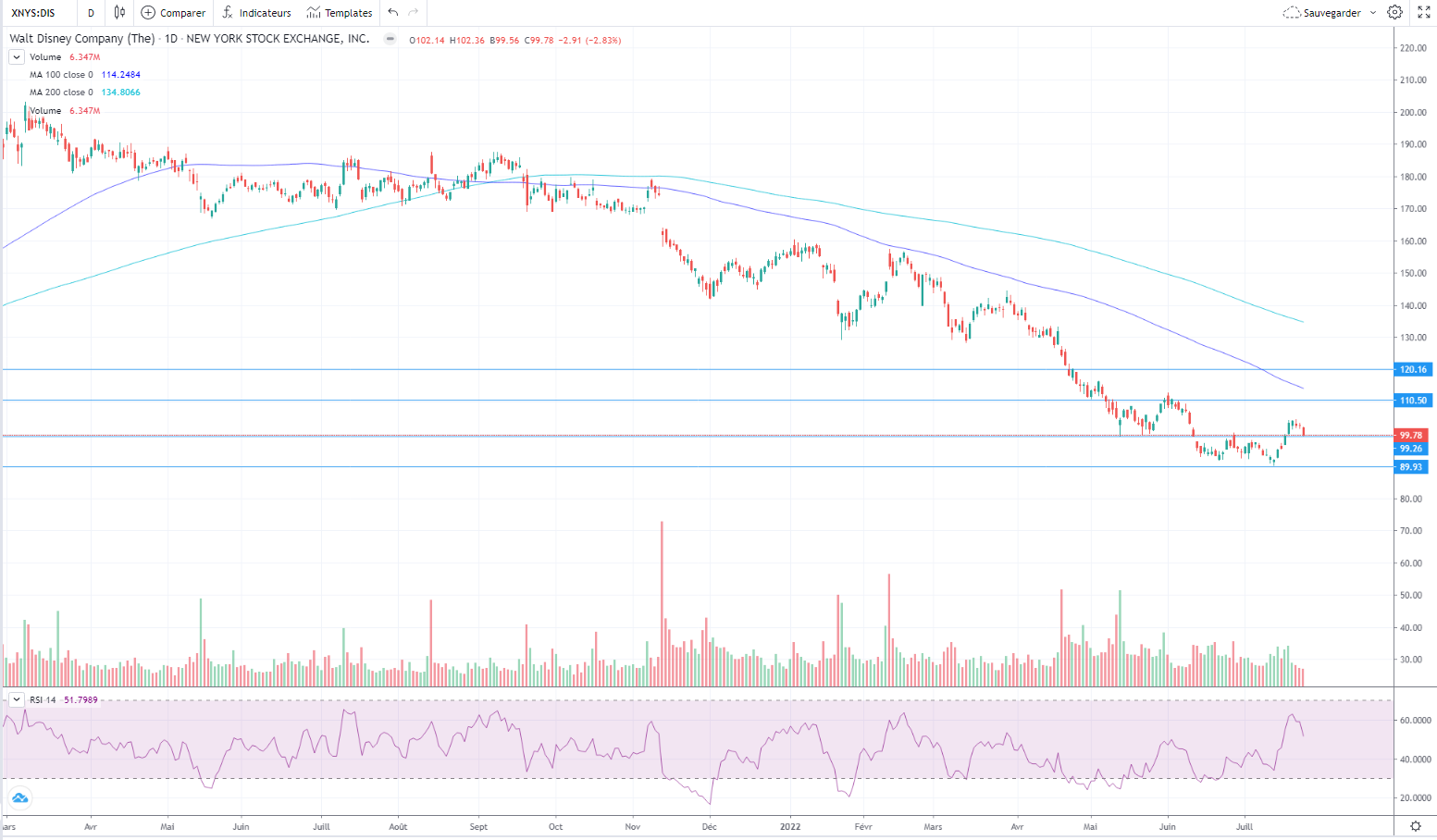 Depuis les plus hauts de fin 2021, L’action Walt-Disney a corrigé de plus de 50%.