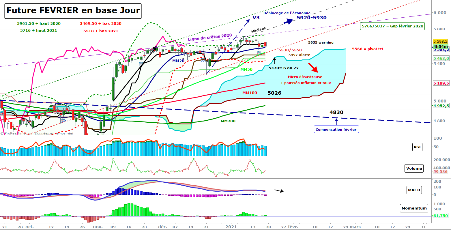 Les points sur le future FEVRIER sont, à la hausse, 5651 (sensible à MT, à reprendre au fixing hebdo), 5713 (sensible à TCT), 5716 (+ haut figure actuelle), 5755 (très fort sur la semaine, ligne de crêtes 2020), 5780/5785 (très fort, résistance mensuelle cash et compensation février au 19), 5790/5820 (résistance daily et hebdo), puis 5766-5837 // 5860.25-5995.14 (gap baissier hebdomadaire de février, future février et cash) voire 5920 (Target V3), 5930/6085 (cibles de retracement mensuel) et à la baisse, 5635 (1er warning à TCT = Tenkan daily, cassé au fixing !), 5583 (MM20 jours et 1er point d’inflexion), 5566 (1ère alerte de CT), 5530 (SOH Jour), 5514 (support cash sensible de MT), 5497 (1ER warning de MT), 5470 (support au 22 janvier), 5463 (cible retracement daily), 5327(cible de retracement idéale) puis 5278 (MM200 semaines sur le cash) voire 5164/5155 (MM100 semaines et 20 moiset, cruciales pour les stratégies longues).