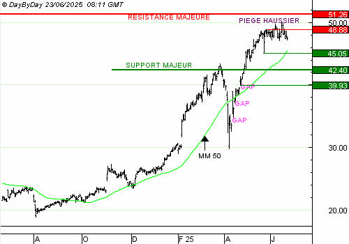 Le Turbo Infini BEST PUT SOCIETE GENERALE XX28V ISIN DE000VG8QBP1 peut actuellement être vendu à 2,24 EUR, générant un profit de +20 %. Le reste de la position peut être conservé pour viser 42,4 euros.
