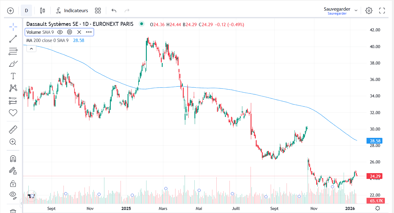 Le titre dassault systemes se reprend après une baisse de 60 % depuis les plus hauts, une figure de retournement se construit.