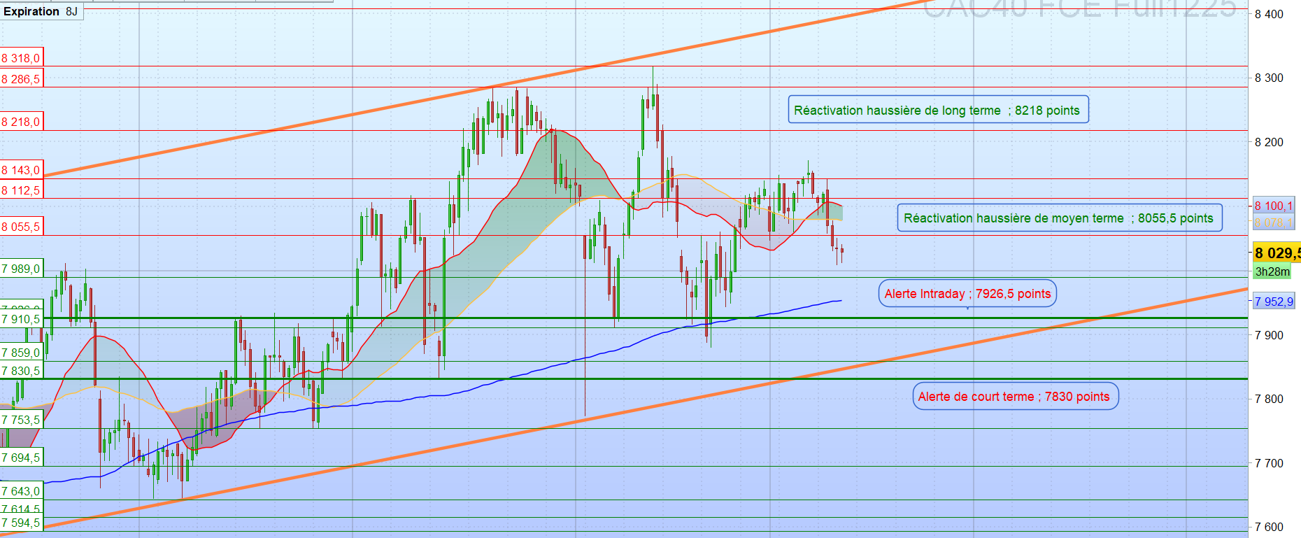 À l’inverse, une reprise du mouvement ascendant passera par le retour du mouvement acheteur et le franchissement de ses résistances à 8 055,5 puis 8 143 et 8 218 points. Au-delà, l’objectif naturel se situerait à proximité de la borne haute du canal, autour de 8 360 points, dont un dépassement durable validerait une tendance haussière plus ancrée.
