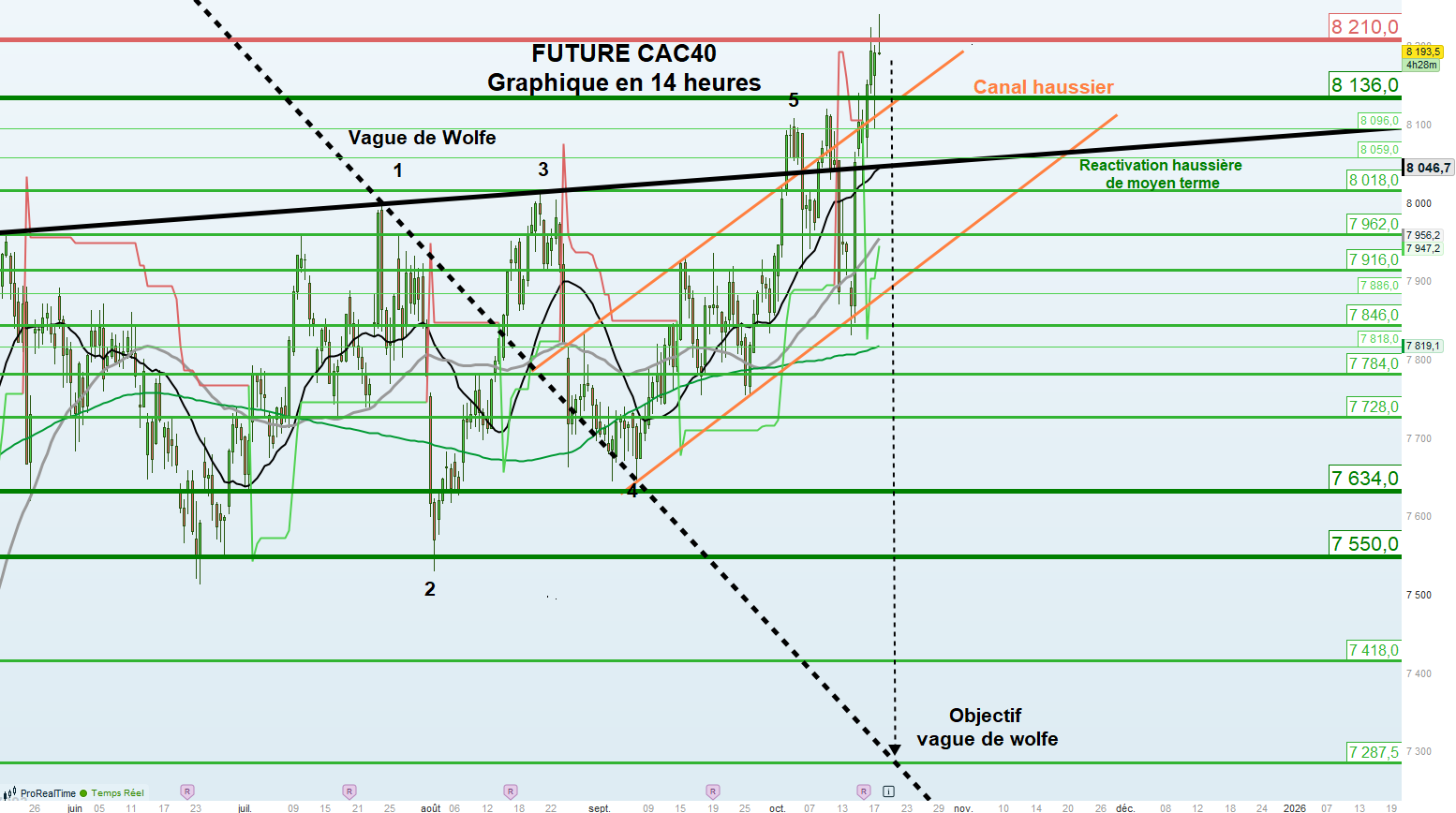 À l’inverse, un rebond sur les 7 115 points, suivi d’un franchissement en force et confirmé en clôture sur au moins trois séances consécutives au-dessus des 8 210 points, invaliderait de manière définitive la structure de retournement en vague de Wolfe. Un tel scénario marquerait la reprise en main du courant acheteur et réactiverait la dynamique haussière de long terme, ouvrant la voie à un mouvement d’extension en direction des 9 364 points. Il conviendrait toutefois de demeurer attentif à la capacité de l’indice à franchir les résistances majeures situées à 8 359 et 8 636 points, niveaux obtenus par réplication, dont le dépassement confirmerait la pleine réaffirmation du biais haussier de fond.