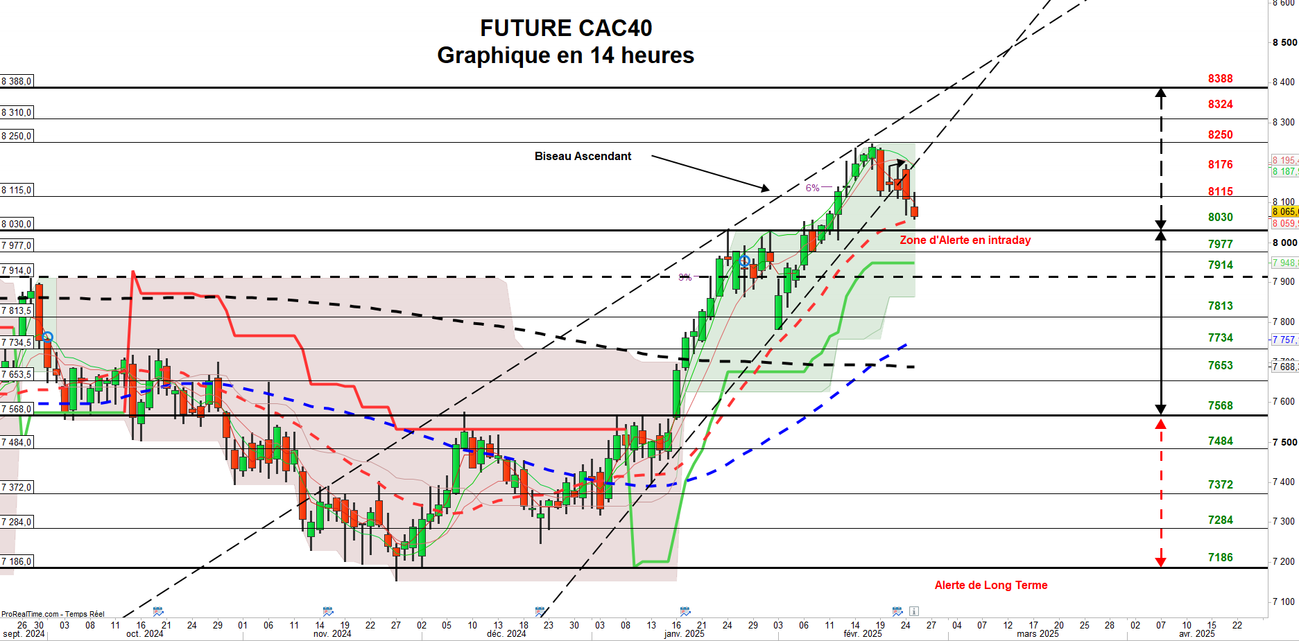 A contrario, un repli sous la Zone d’Alerte en intraday, correspondant à la moyenne mobile 50 en 14 heures située à 8 030 points, fragiliserait la tendance et ouvrirait la voie à une consolidation plus appuyé vers le seuil des 7900, voire des 7800 points.