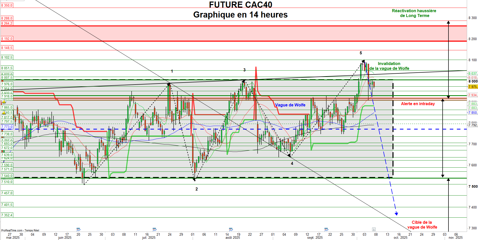 En cas de franchissement confirmé en clôture de la zone des 8080/8100 points, un mouvement de reprise pourrait s’enclencher, avec pour cibles potentielles la zone des 8190 à 8250 points, voire une extension vers 8288 points.