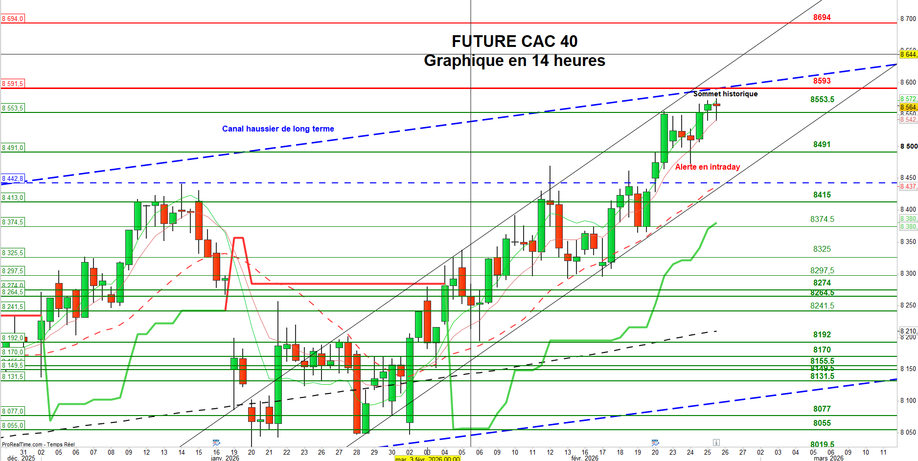 A l’inverse, un retour sous 8 491 points fragiliserait la dynamique actuelle et pourrait entraîner une consolidation en direction du support situé à 8 442 points.
