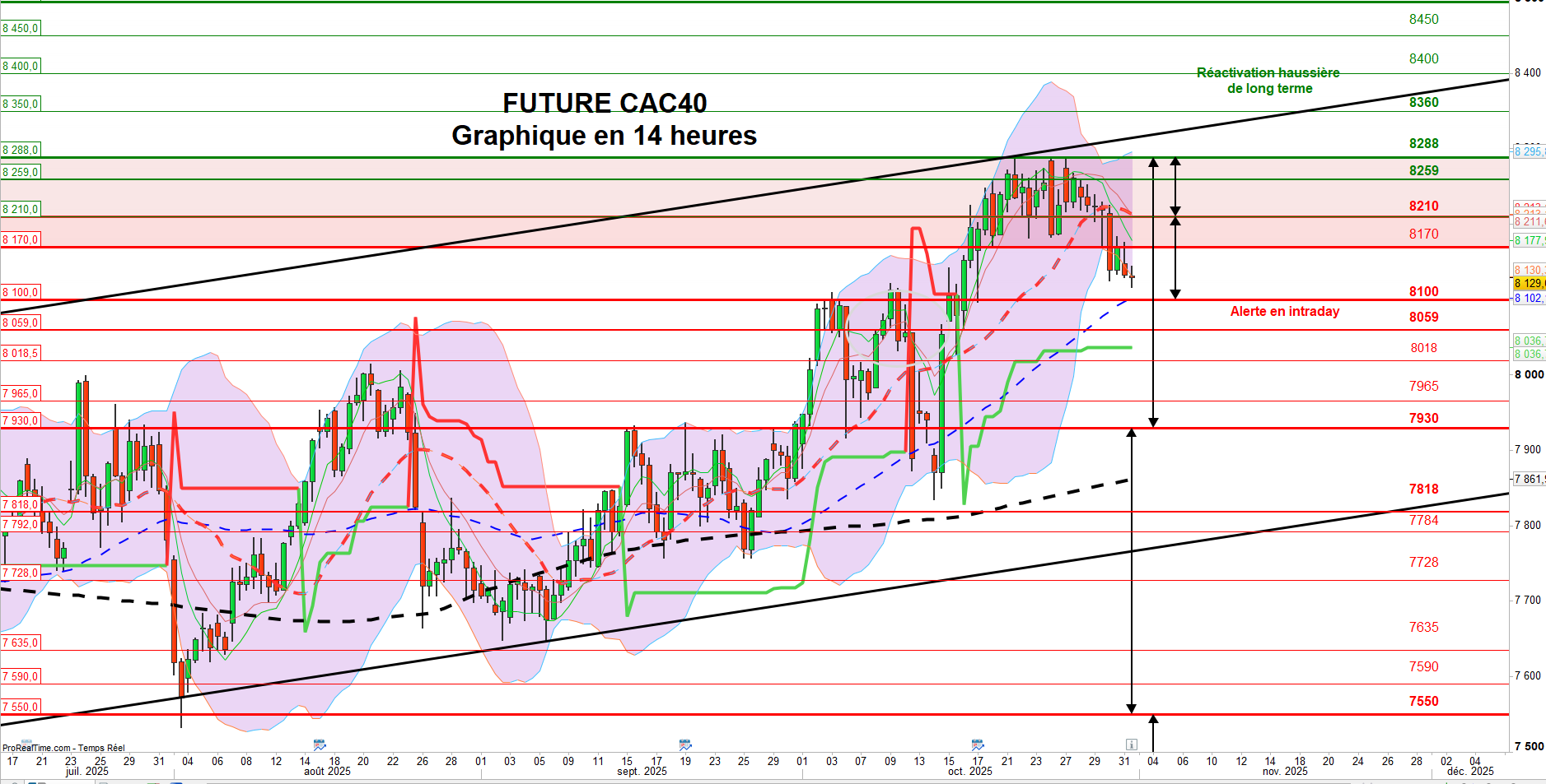 Un retour durable au-dessus des 8210 points permettrait d’envisager une relance à court terme, qu’il conviendra de confirmer par un franchissement net et en clôture des résistances majeures situées à 8259 et 8290 points.
