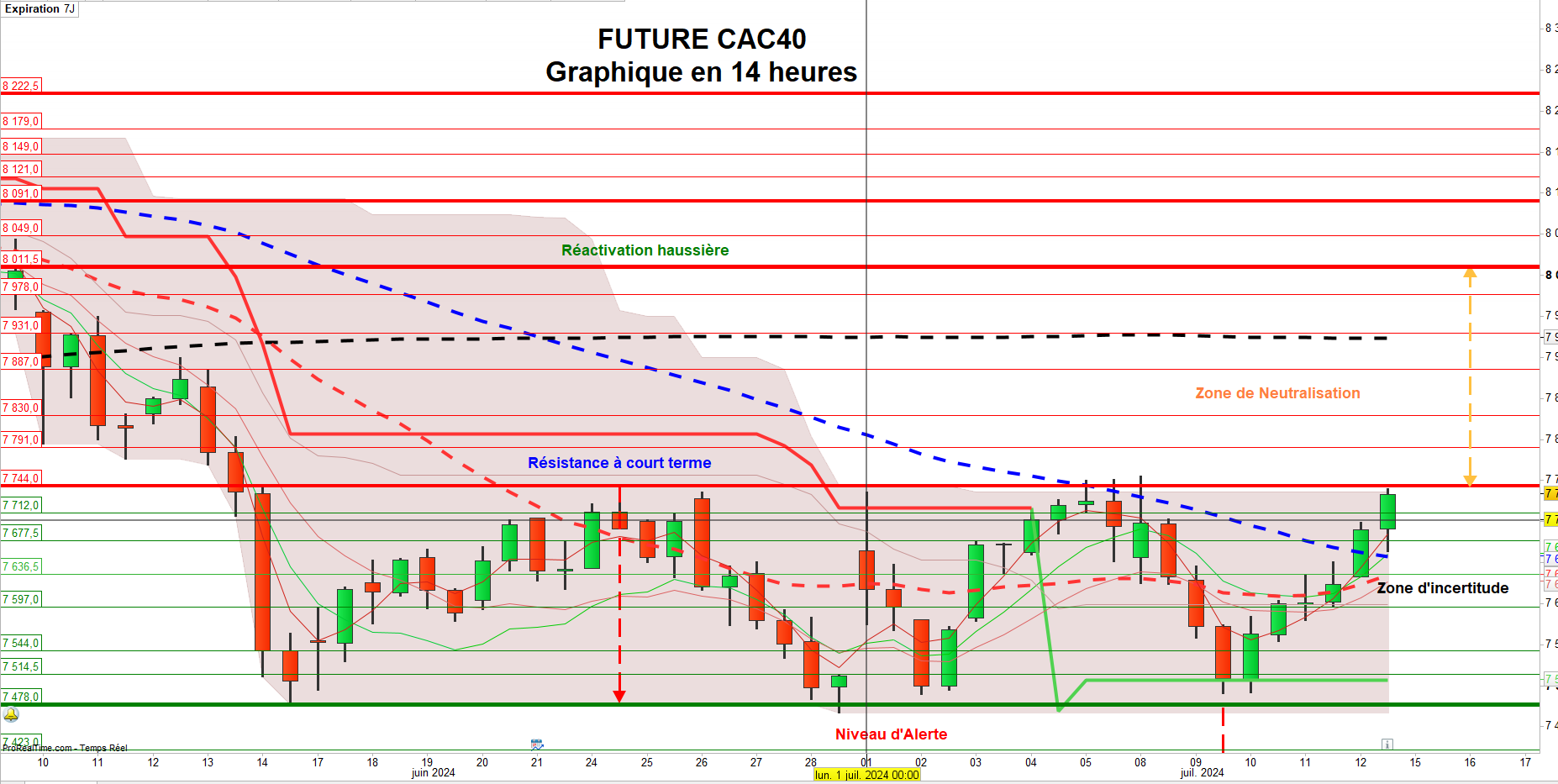 Graphiquement, le Future CAC40 (Cf. graphique joint en 14 Heures) confirme son rebond de court terme, après s'être appuyé mardi sur la zone d'alerte à 7480. Le CAC 40 est donc reparti à la hausse, a comblé le gap baissier du 9 juillet et a ouvert un gap haussier ce matin entre 7645,98 et 7659,09.