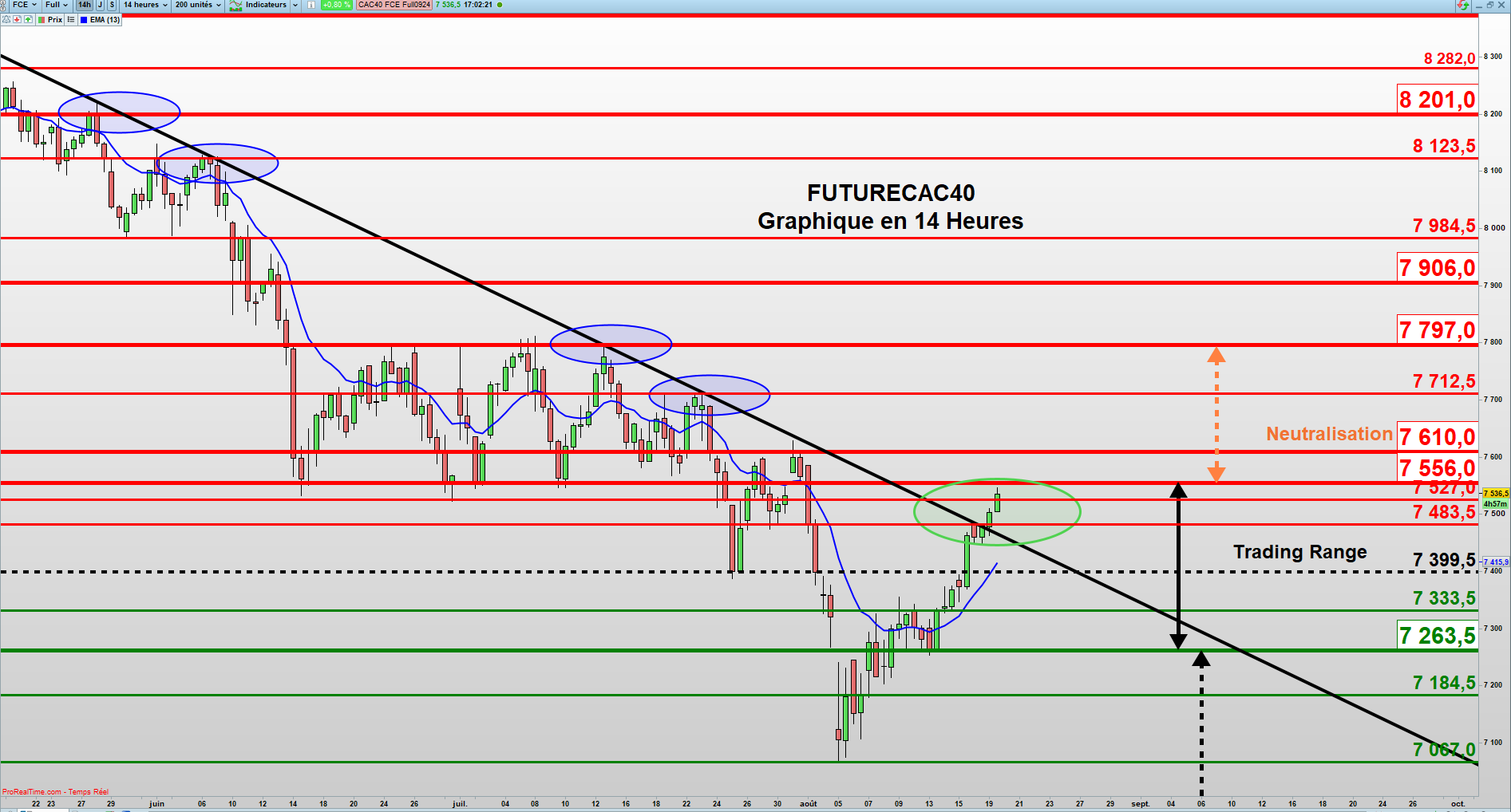 Le retour sous 7483 et surtout sous la ligne de tendance baissière fraichement débordée et située à 7564 pour la séance du 20 Août, donneraient un signal d’invalidation et donc d’alerte avec comme première cible la médiane à 7399 du trading range. La cible légitime suivante serait 7263 avec une probabilité de rupture de ce niveau de réactivation de la tendance baissière accrue.