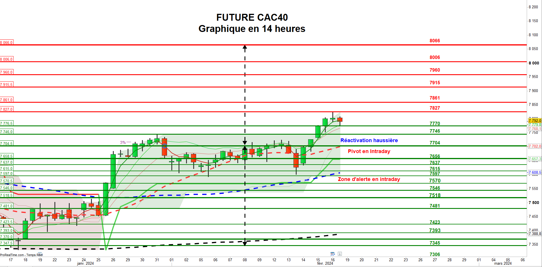 A contrario, un retour sous le point haut du 31 janvier situé à 7746 points affaiblirait la dynamique actuelle et la cassure de la zone de réactivation haussière à 7704 pourrait la mettre en danger.