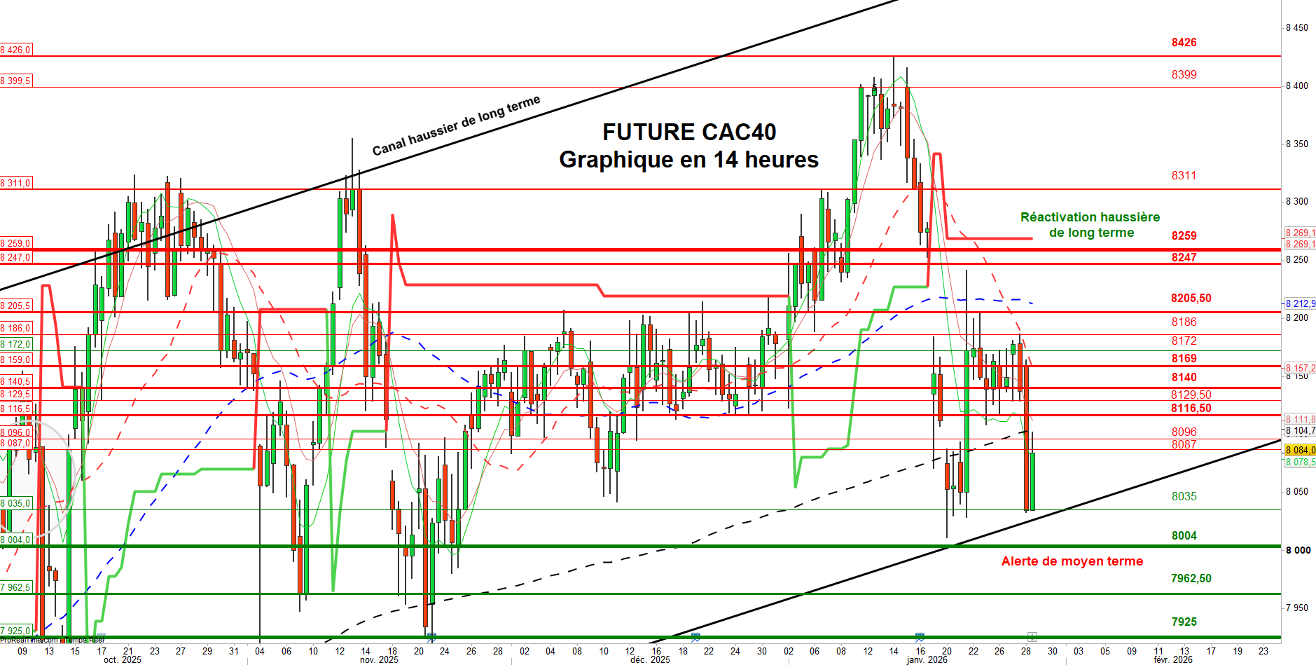 À l’inverse, une rechute sous le point bas de la séance, situé à 8033 points, relancerait la phase de consolidation en direction de la borne basse du canal haussier de long terme, ainsi que de la zone d’alerte à moyen terme située à 8004 points.
