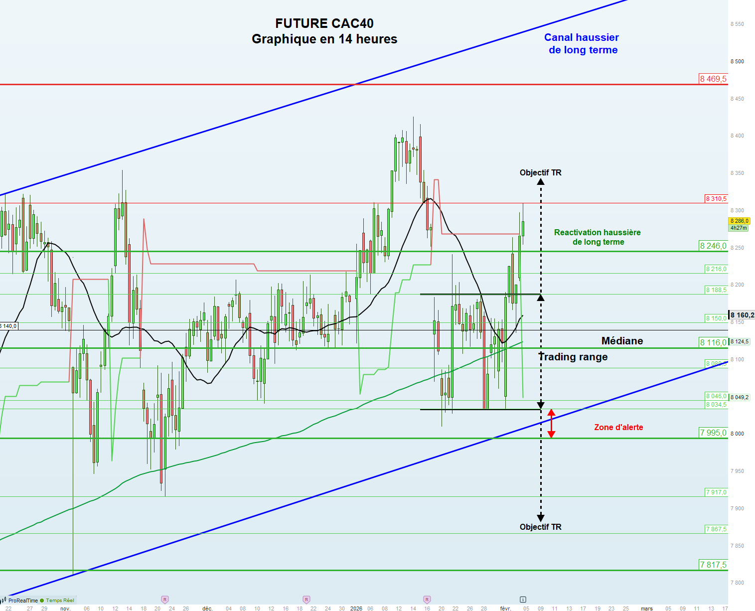 Graphiquement, le Future CAC 40 (cf. graphique en données 14 heures) est finalement parvenu à s’extraire par le haut du trading range délimité entre 8 034,5 et 8 188,5, après avoir cherché à invalider la précédente sortie en réalisant une brève incursion au sein de cette zone lors de la séance précédente. Le fait que l’indice ne soit pas parvenu à revenir tester la médiane et le niveau pivot à 8 116 points témoigne de la résilience du marché et de sa volonté de maintenir la structure actuelle. Une clôture confirmée au-dessus de 8 188,5, et plus particulièrement au-dessus du niveau clé de réactivation haussière à 8 246 points, marquerait la fin de la consolidation entamée le 19 janvier, avec une cible à 8 344 points, déterminée par la réplique de la hauteur de la zone de congestion. Au-delà, la cible se situerait sur les plus hauts historiques, autour des 8 400 points, puis sur la partie haute du canal haussier de long terme, à 8 540 points.