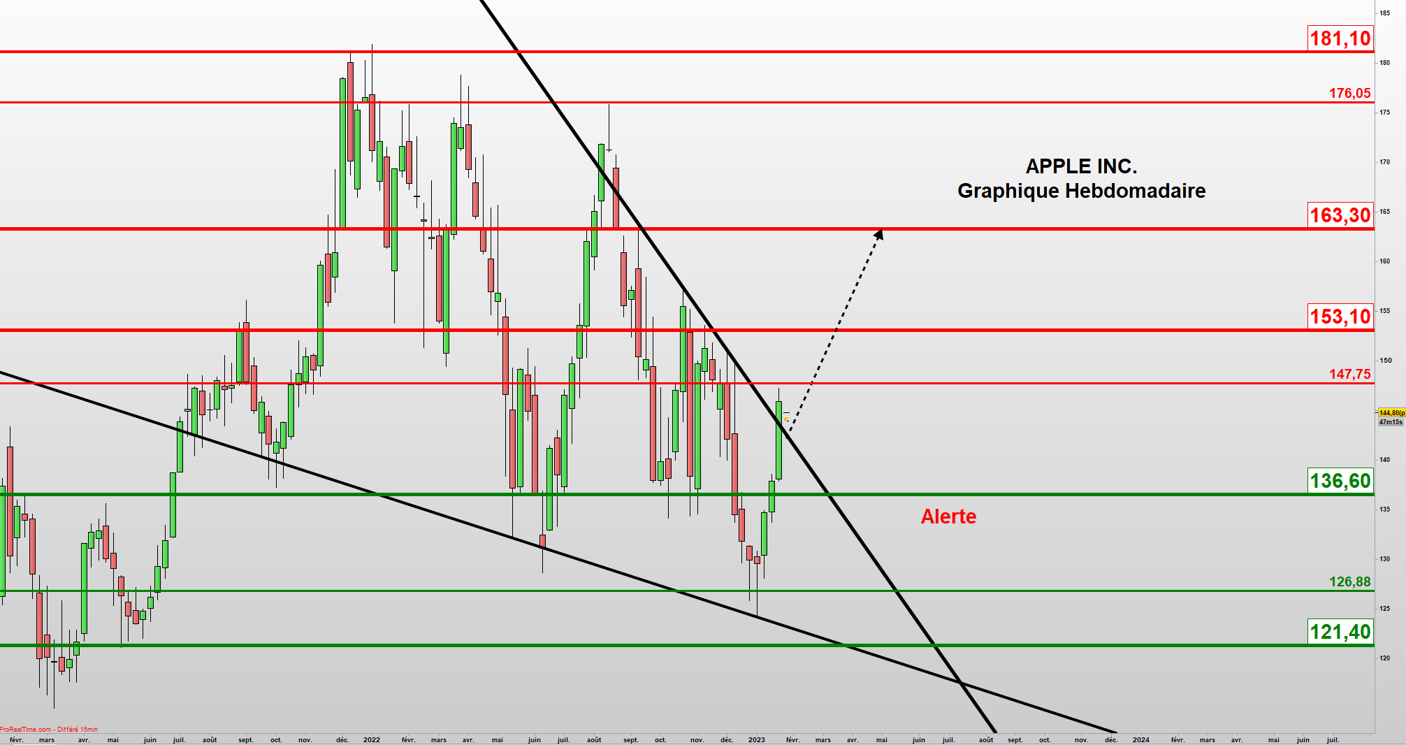 Il évoluait depuis janvier 2022, sous une ligne de tendance baissière de long terme. Or, au cours de la semaine du 23 janvier 2023, l’indice a puissamment débordé cette oblique baissière, en s’adjugeant 4,71%, dans un volume nettement supérieur aux jour précédents. Il rompt ainsi franchement avec la tendance baissière. On constate, par ailleurs, le Double Bottom, formé entre 10690 et 10960, mi-octobre et fin décembre. Ainsi, la résistance majeure à 12230, contre laquelle le Nasdaq vient de buter, forme la ligne de cou de cette figure. Or, le débordement en clôture hebdomadaire de 12230, validerait la figure de retournement haussière en Double Bottom, afin de cibler 13720 qui est aussi une résistance majeure. On surveillera le comportement des prix aux abords du gap baissier hebdomadaire, laissé ouvert le 22 août dernier, entre 13175 et 13210, qui offre un niveau de résistance majeure.
