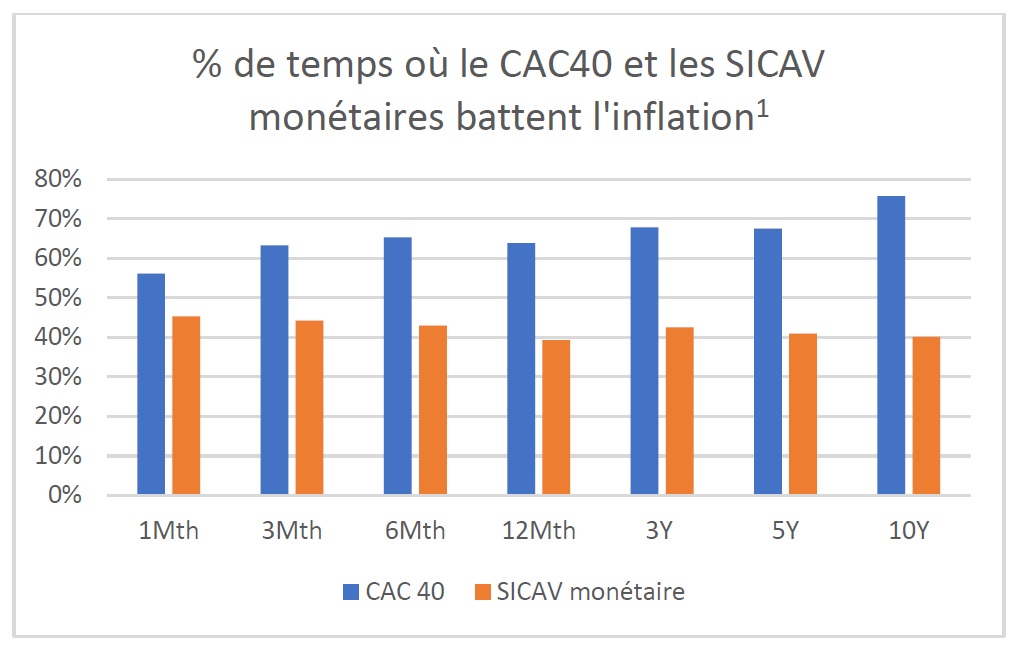 Les performances passées ne présagent pas des performances futures, mais il est toujours intéressant d’analyser les rendements historiques des différentes classes d’actifs. En comparant la performance des SICAV monétaires et du CAC 40 à l’inflation, on peut regarder, sur différents horizons d’investissement, quel a été le meilleur placement.