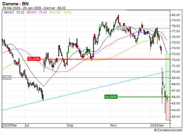 Le récent mouvement baissier a renvoyé le titre Danone au contact de niveaux intéressants situés vers 66 EUR. Cette zone pourrait faire barrage au trend baissier de ces dernières séances et confère un bon timing à l'ouverture de positions acheteuses.