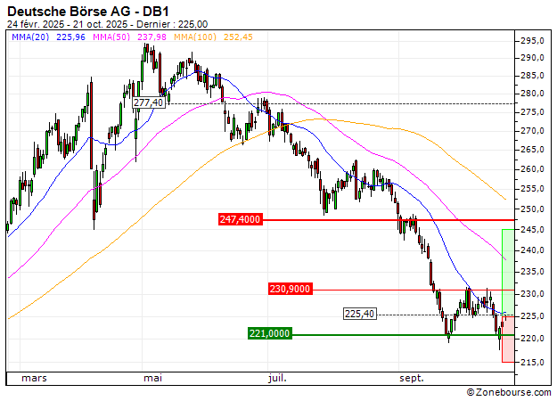 La pression vendeuse pourrait s'essouffler prochainement sur le titre Deutsche Börse AG. En effet, la zone support actuellement testée des 221 EUR arrive en renfort et pourrait contenir, au moins à court terme, les velléités baissières.