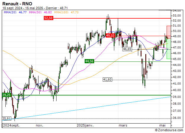 Le titre Renault montre actuellement quelques signes d'essoufflement au contact des 50 EUR et pourrait amorcer une nouvelle phase de consolidation dans les séances à venir. Les récentes révisions baissières des perspectives de bna et la configuration technique laissent présager d'un retour sur les 45 EUR à brève échéance.