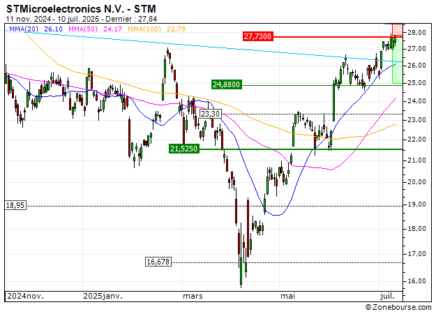 La valeur STMicroelectronics N.V. est, en effet, en zone de surachat et la proximité du niveau actuellement testé confère un timing intéressant pour mettre à profit une correction technique dans les séances à venir en direction des 25 EUR.