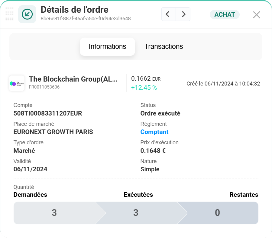 Visualisez toutes les propriétés de votre ordre et son statut d’exécution.